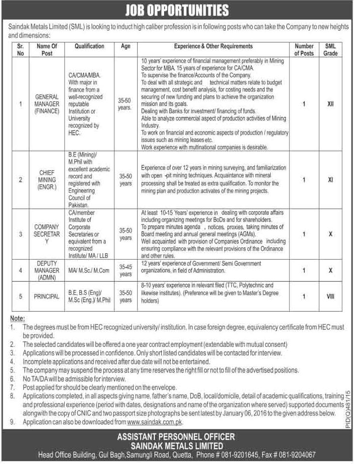 Jobs Saindak Metals Limited (SML) December 2015. Copyright The Daily The News Newspaper Pakistan.
